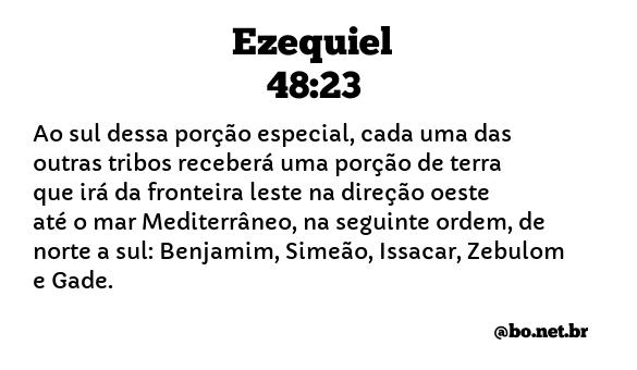 ( 23 – 27 ) Ao sul dessa porção especial, cada uma das outras tribos receberá uma porção de terra que irá da fronteira leste na direção oeste até o mar Mediterrâneo, na seguinte ordem, de norte a sul: Benjamim, Simeão, Issacar, Zebulom e Gade. (Ezequiel 48:23 NTLH)