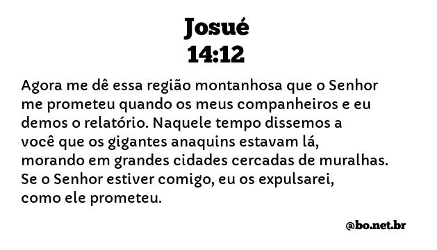Agora me dê essa região montanhosa que o SENHOR me prometeu quando os meus companheiros e eu demos o relatório. Naquele tempo dissemos a você que os gigantes anaquins estavam lá, morando em grandes cidades cercadas de muralhas. Se o SENHOR estiver comigo, eu os expulsarei, como ele prometeu. (Josué 14:12 NTLH)
