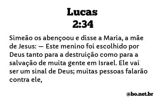 Simeão os abençoou e disse a Maria, a mãe de Jesus: —Este menino foi escolhido por Deus tanto para a destruição como para a salvação de muita gente em Israel. Ele vai ser um sinal de Deus; muitas pessoas falarão contra ele, (Lucas 2:34 NTLH)