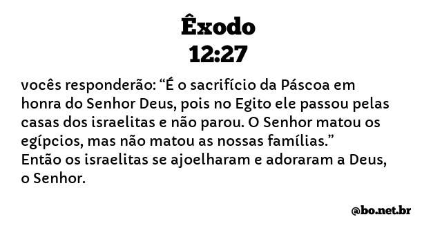 vocês responderão: “É o sacrifício da Páscoa em honra do SENHOR Deus, pois no Egito ele passou pelas casas dos israelitas e não parou. O SENHOR matou os egípcios, mas não matou as nossas famílias. ” Então os israelitas se ajoelharam e adoraram a Deus, o SENHOR. (Êxodo 12:27 NTLH)