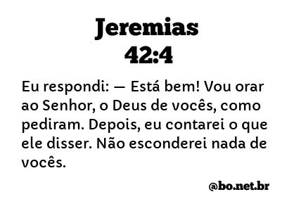 Eu respondi: —Está bem! Vou orar ao SENHOR, o Deus de vocês, como pediram. Depois, eu contarei o que ele disser. Não esconderei nada de vocês. (Jeremias 42:4 NTLH)