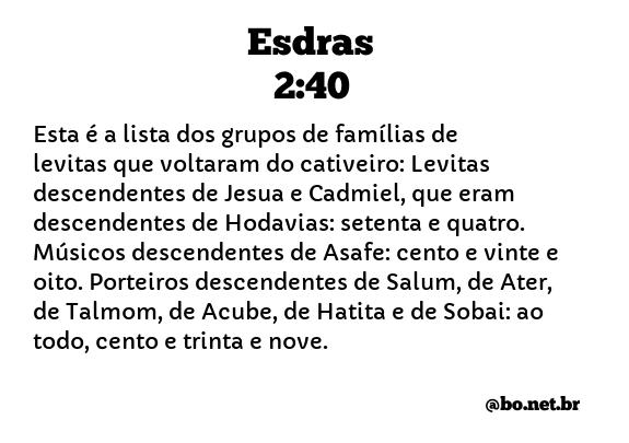 Esta é a lista dos grupos de famílias de levitas que voltaram do cativeiro: Levitas descendentes de Jesua e Cadmiel, que eram descendentes de Hodavias: setenta e quatro. (Esdras 2:40 NTLH)