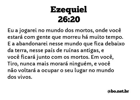 Eu a jogarei no mundo dos mortos, onde você estará com gente que morreu há muito tempo. E a abandonarei nesse mundo que fica debaixo da terra, nesse país de ruínas antigas, e você ficará junto com os mortos. Em você, Tiro, nunca mais morará ninguém, e você não voltará a ocupar o seu lugar no mundo dos vivos. (Ezequiel 26:20 NTLH)