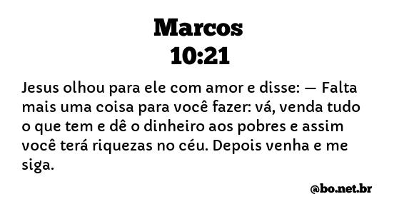Jesus olhou para ele com amor e disse: —Falta mais uma coisa para você fazer: vá, venda tudo o que tem e dê o dinheiro aos pobres e assim você terá riquezas no céu. Depois venha e me siga. (Marcos 10:21 NTLH)