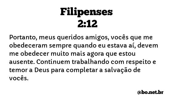 Portanto, meus queridos amigos, vocês que me obedeceram sempre quando eu estava aí, devem me obedecer muito mais agora que estou ausente. Continuem trabalhando com respeito e temor a Deus para completar a salvação de vocês. (Filipenses 2:12 NTLH)